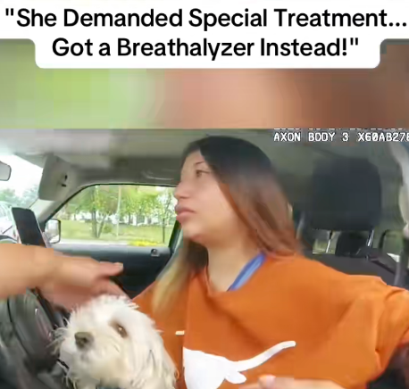 A dramatic traffic stop took an unexpected turn when a woman, pulled over by police, demanded “special treatment” — but instead found herself facing a breathalyzer test. The bodycam footage, which has now gone viral, shows the woman trying to charm her way out of trouble with excuses, attitude, and even her adorable little dog sitting on her lap.