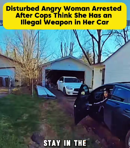 Bodycam footage shows the moment officers approach the black sedan parked in a driveway. One officer commands, “Stay in the car, ma’am,” while another keeps a safe distance, his hand near his holster. The woman, visibly agitated, yells back that she “didn’t do anything wrong.”