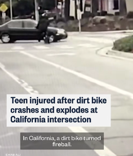 A California teenager is recovering after a dirt bike crash turned into a shocking explosion at a busy intersection — an incident that stunned drivers, terrified witnesses, and quickly went viral after security footage captured the dramatic moment the bike burst into flames.